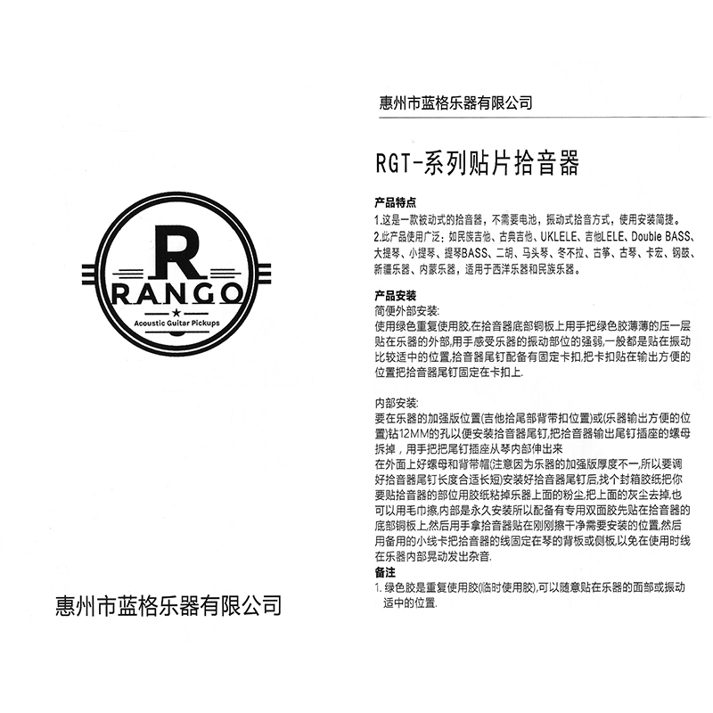 产品名:RANGO RGT2 手工拾音器 两贴片(乐器通用)